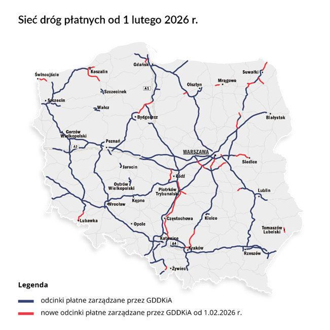Od 1 lutego 2026 planowane jest rozszerzenie sieci płatnych dróg o około 645 km nowych odcinków.